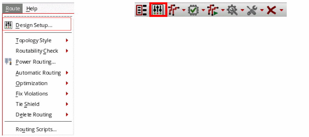 Choose Route – Design Setup or click the Design Setup icon on the Virtuoso Space-based Router toolbar.