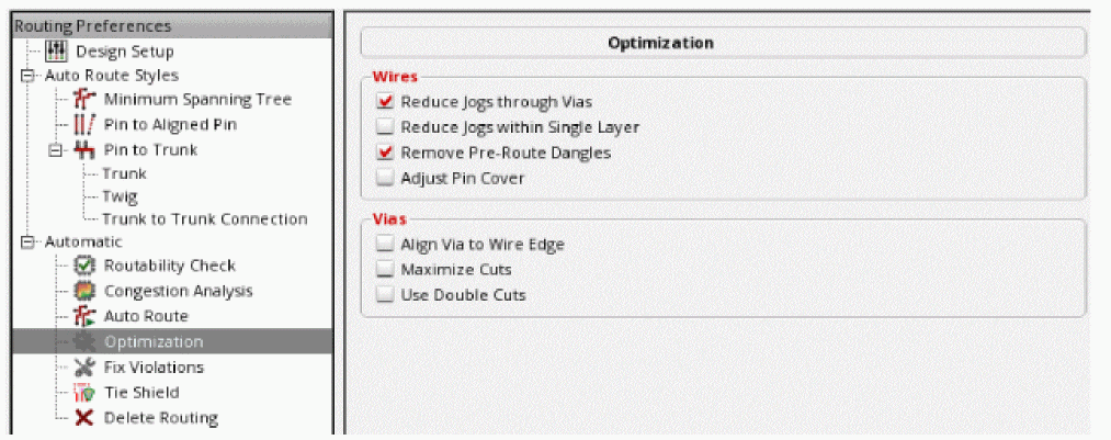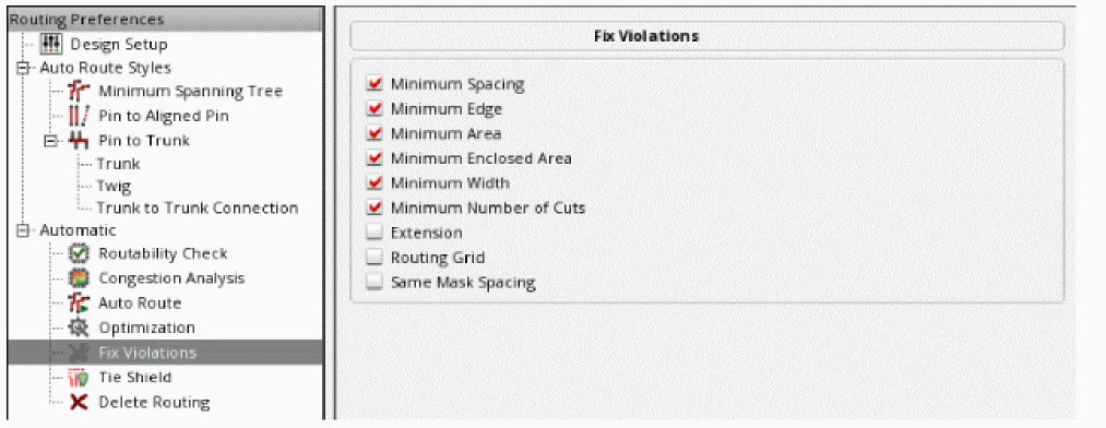 The Prefer violations to opens option affects only automatic routing. It does not have any effect on interactive and assisted routing commands. To control whether violations are allowed in assisted and interactive routing commands, such as Finish Wire, Finish Bus, Finish Trunk, Point-to-Point, and Guided routing, select Enforce in the DRD Options form. -