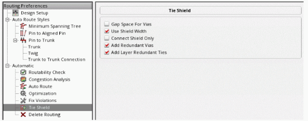The Tie Shield command is used for tying the shielding wires together and to bring the connected shielding wires to the nearest power source, which can be part of a power pin, power ring, or trunk. The Tie Shield command is not used for routing the entire shielding net. It is recommended that before tying the shielding wires together to the routed power net, power routing is performed.