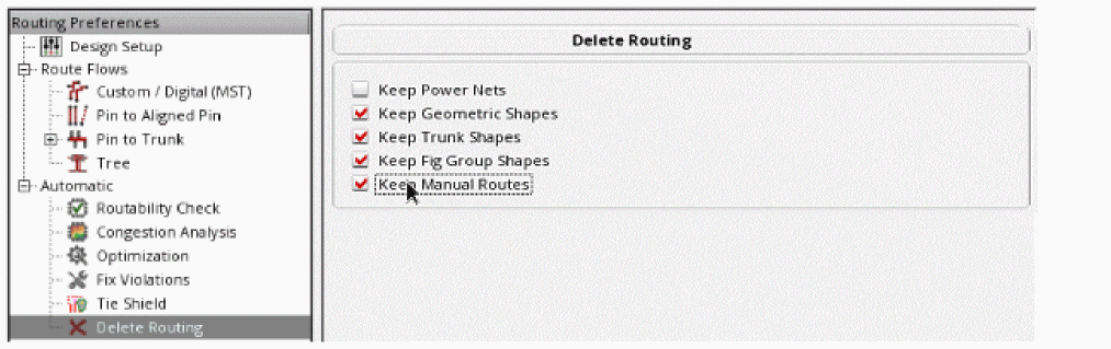 Delete Routing is an interactive command where you explicitly ask for the routing to be deleted. Clicking Delete Routing from the Automatic tree under Routing Preferences option deletes all the routing in FIXED constraints. However, the routes in the LOCKED constraint are not deleted.