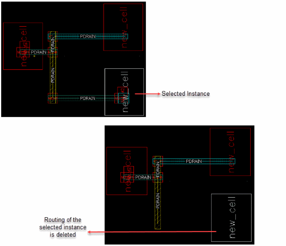 When certain instances or devices are changed in the schematic, you can delete only the routes that are connected to those devices, while ensuring that trunks and any fixed preroutes on that net are preserved, swapped, and rerouted. To do this: