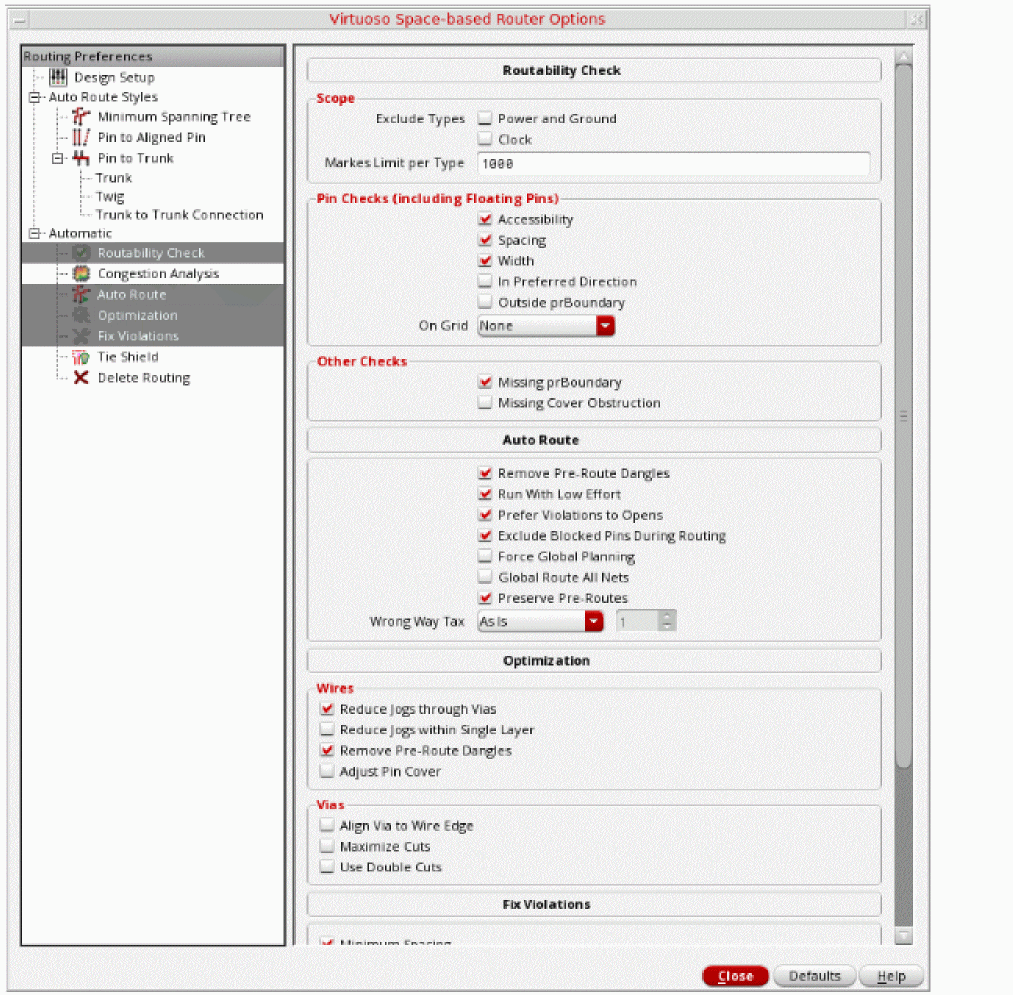 The Virtuoso Space-based Router Options form is divided into two panes, the left pane and the right pane. The left pane contains a hierarchically arranged collection of routing commands. When you select a command in the left pane, all options for that command are displayed in the right pane. The Defaults button can be used to reset the options that are currently displayed in the right pane of the Virtuoso Space-based Router Options form to their default values.