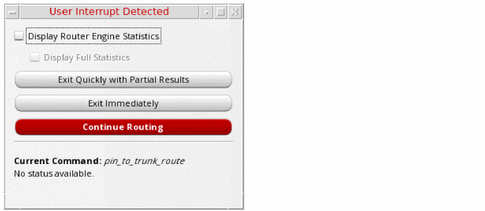 Completes the current routing step as quickly as possible. The results are saved and routing exits without any further routing steps. You can view and edit the routing results that are saved. By viewing the routing results, you are able to identify the types of issues that are encountered by the router at the time of interruption. -