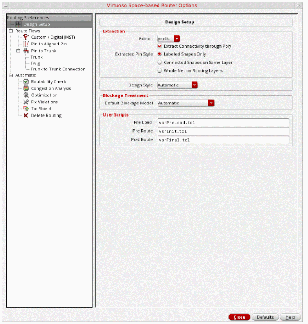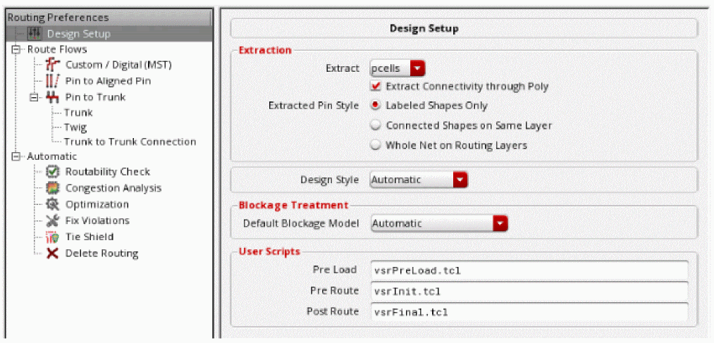 The design style is automatically determined based on the size of the layout and the composition of macro instances. This evaluation happens when the design is first processed by the routing commands. The design style is retained until explicitly re-evaluated using the Refresh button to the right of the design style field. -