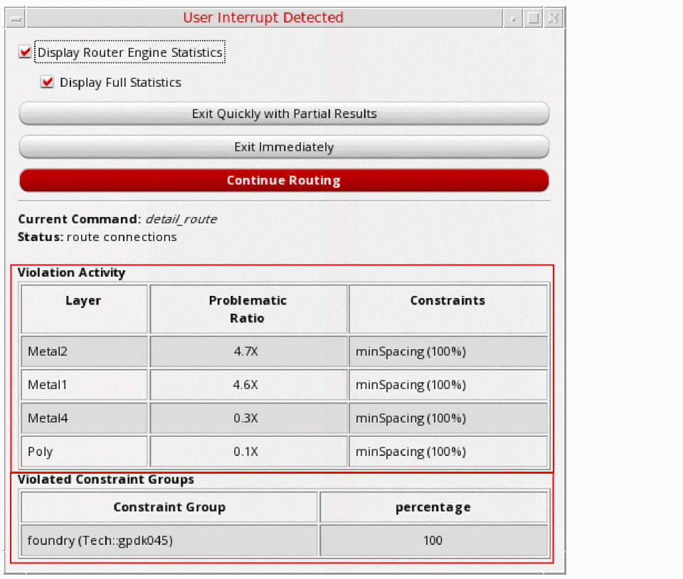 While routing a design, there are some errors that can occur due to data or technology setup issues, which could not be recognized by the routability checker. If the router is taking too long to complete, you can stop the current run using Ctrl + C and investigate what the issues might be.