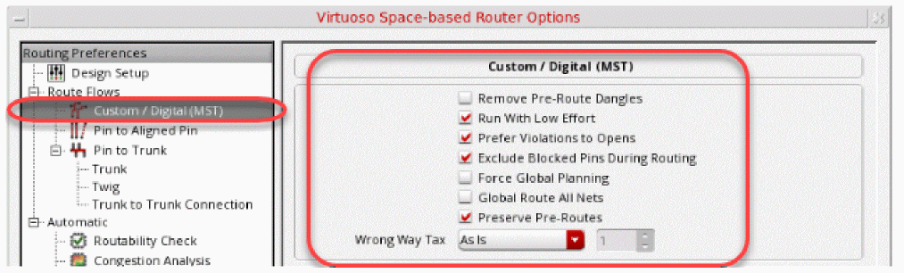 Custom/ Digital (MST) router then routes the remaining opened pins on nets with trunks and also routes all the pins on nets without trunks.Only standard cells designed with the area-based rules that exists in the PDK technology file are supported for the Custom/ Digital (MST) routing flow. For example, if the PDK technology file only contains area-based rules for the minimum spacing of one area, but the standard cells are designed with area-based rules for another area that allow smaller spacing values, the standard cells have false violations and do not route appropriately. Therefore, only standard cells designed with the same rules that are in the PDK are supported.