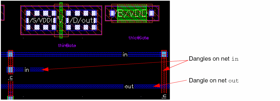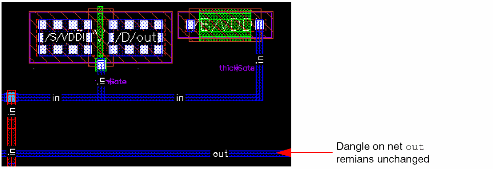 inwas selected for routing. As a result, both the dangles on netinare removed. Since netoutwas not selected, the dangle on netoutremains unchanged.