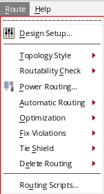 The Route menu is available by default in Layout Suite XL and higher tiers. It provides access to a set of commands that let you use the various available routing features. To view the routing commands, click the Route menu in the layout window. The Route commands are displayed as shown in the figure below.