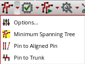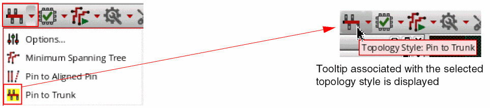 Click a routing style, Custom / Digital (MST), Pin to Aligned Pin, Pin to Trunk, or Tree to select a routing style for routing the design. You can choose only one routing style at any given time. A yellow highlight is displayed around the routing style that is selected, and the toolbar icon is updated to display the symbol and the tooltip associated with the selected routing style. For example in the following figure, the Pin to Trunk topology style is selected.