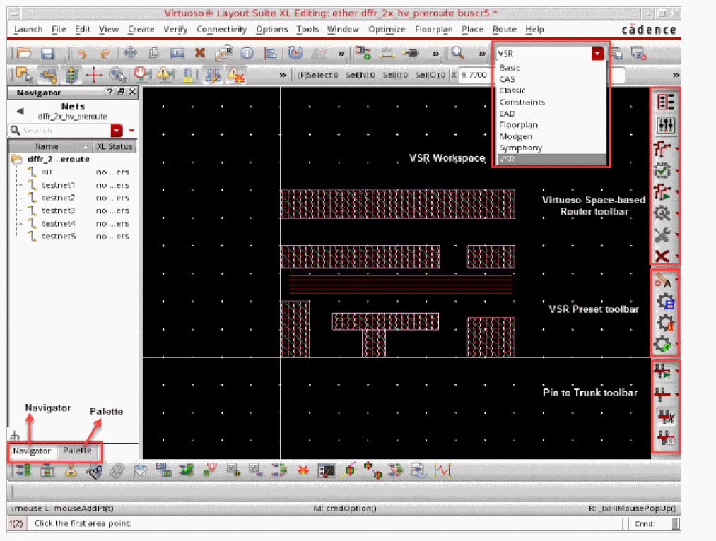 Virtuoso Space-based Router has its own workspace in Layout Suite XL and higher tiers. The VSR workspace shows the canvas, the toolbars (Virtuoso Space-based Router, VSR Preset, and Pin to Trunk). These toolbars are available by default, vertically docked to right of the layout window. The VSR workspace also shows the Navigator and Palette assistants.