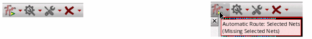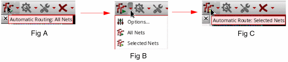 For example, the Automatic Routing icon in Fig A shows that the default action for Automatic Routing is All Nets. The Fig B displays the enabled Selected Nets option after you have selected one or more nets from the Navigator Assistant. In Fig C, the tooltip of the icon changes from Automatic Routing - All Nets to Automatic Routing - Selected Nets after automatic routing is completed on the selected nets. In addition, the Automatic Routing icon on the toolbar changes to the Selected Nets icon.