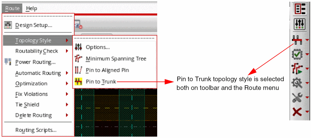 Similarly, for the Topology Style option, the icon of the topology style is synchronized to reflect the topology style that is currently selected. For example, when the Virtuoso Space-based Router toolbar has Pin to Trunk selected as the topology style for routing, the Topology Style submenu displays Pin to Trunk as the active topology style, as shown in the following figure.