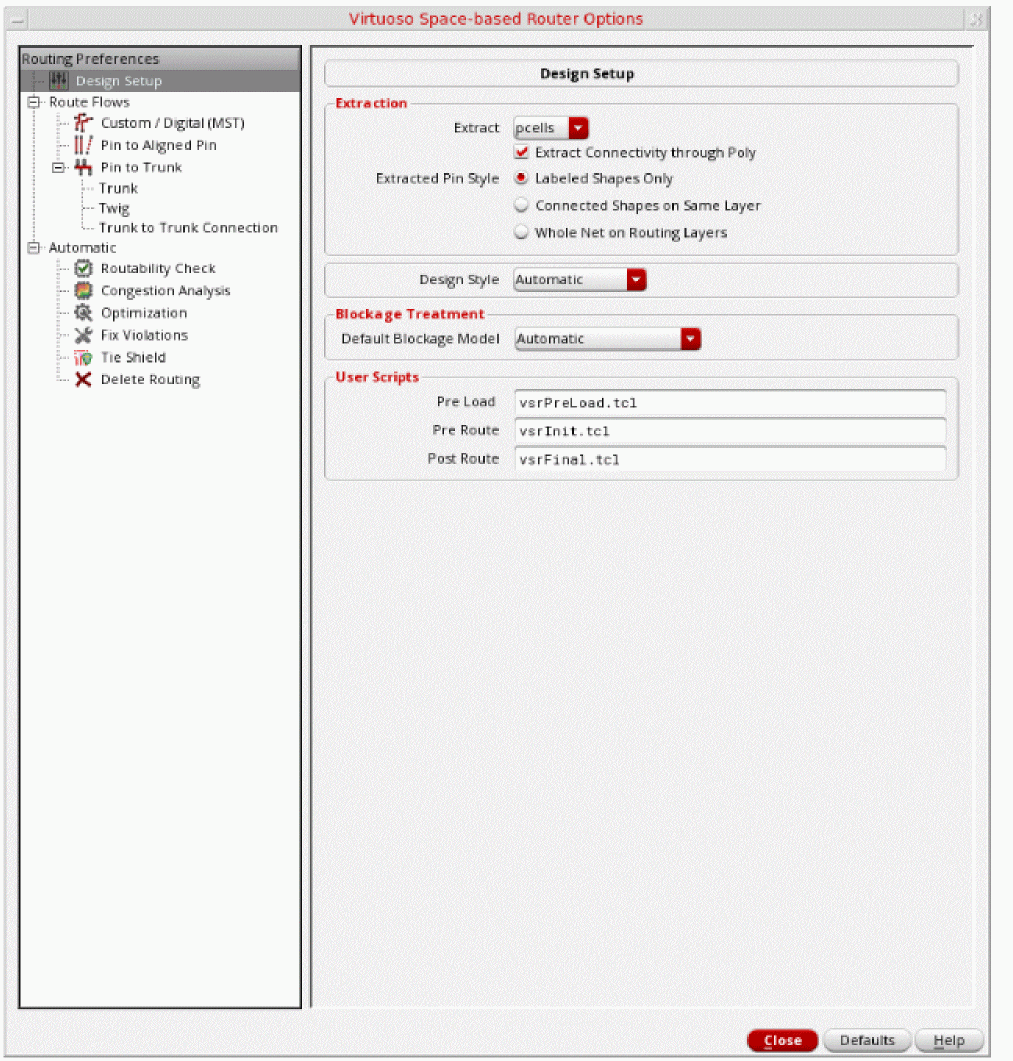 Click the Design Setup icon to view the Virtuoso Space-based Router Options form. Using the Virtuoso Space-based Router Options form you can access a set of hierarchically arranged collection of routing features and options. For more information, see Using the Virtuoso Space-based Router Options Form.