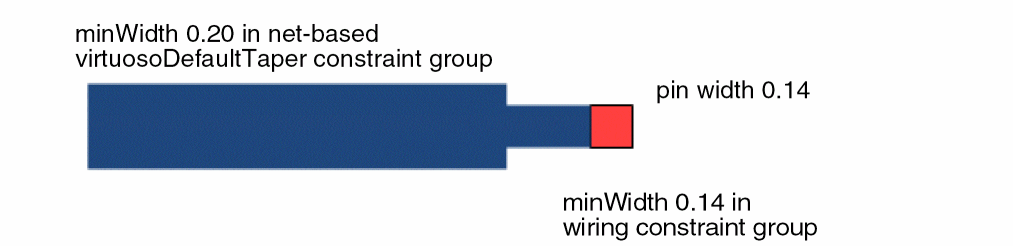 validLayers constraint of the taper constraint group, but some of your nets require a more restricted layer set, use the input and output taper constraint groups to reduce the validLayers list for those specific nets. You can use the Process Rule Editor to assign the validLayers constraint to the input/output taper constraint groups.minWidth defined in that constraint group is greater than the width of the pins, the router may taper down using the minWidth defined in the wire constraint group when connecting to those pins. This optimizes routing for pin connections. The router does not consider the behavior as a violation of the net based constraint group. See the illustration below.