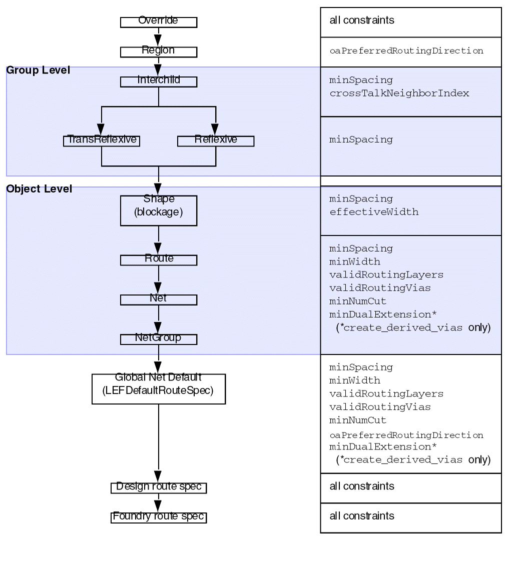 The LEFDefaultRouteSpec constraint group is specific to a LEF/DEF design flow and is created during lef2oa translation. As a result, the valid layers, the valid via definitions, and the valid rules become part of the LEFDefaultRouteSpec constraint group.