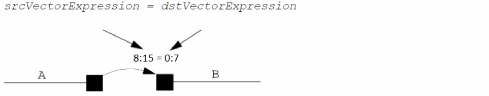 Nets A and B are aliased together. Logically, each object that A is connected to is also connected to B, and the patchcord connects the first bit named in srcVectorExpression to the first bit named in dstVectorExpression.
