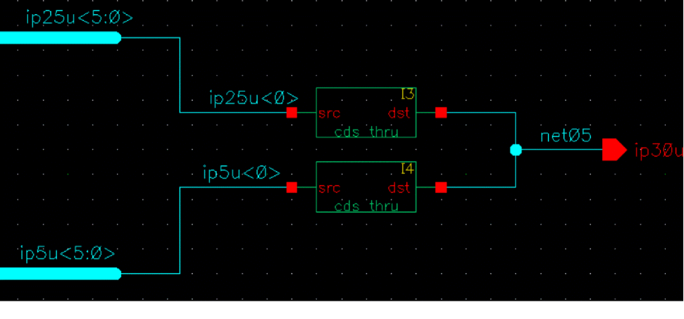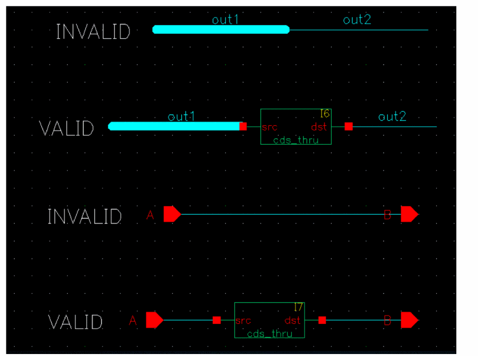 This symbol is used as a component to create a connection that may otherwise be reported as a short. For example, when you need a short between two terminals or between a terminal and a global signal, use cds_thru as it prevents connectivity extraction errors in Virtuoso Schematic Editor due to shorted terminals.