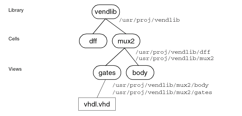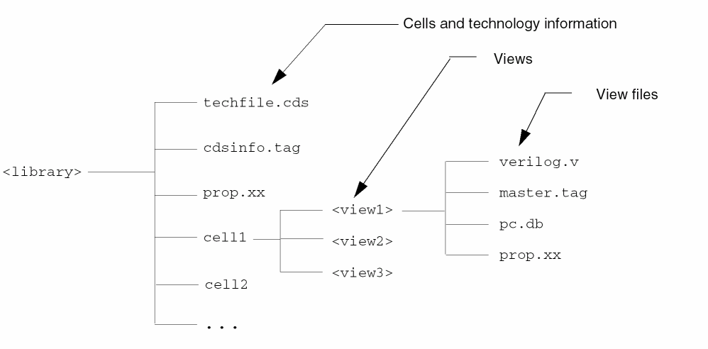 The hierarchy of these directories starts with a library, which is a directory containing both files and other subdirectories. The subdirectories of a library are cells and these cells also contain files or other subdirectories. The subdirectories of cells are views of the cell.
