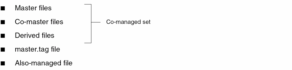 The master file, co-master files, and derived files together make up as a co-managed set for the view. Many operations, especially design management operations, need to treat these files as a set.
