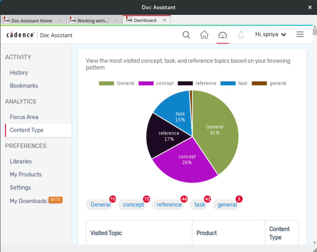 This page displays a pie chart of the most visited concept, task, and reference topics. Links to these topics along with the product name and topic type are also displayed in a table.