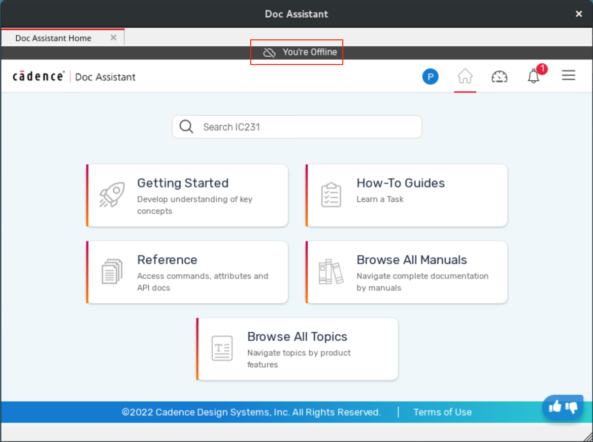 You can use Doc Assistant even when you are working in a restricted environment, where you have limited or no Internet connectivity. In this case, Doc Assistant is launched in Offline mode. You can search content from documents of products that are installed on your machine.