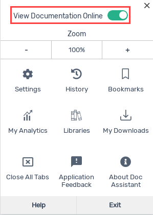 If Doc Assistant is in Online mode, you can switch to Offline mode and set it as the default mode by switching off the View Documentation Online option from the hamburger menu.