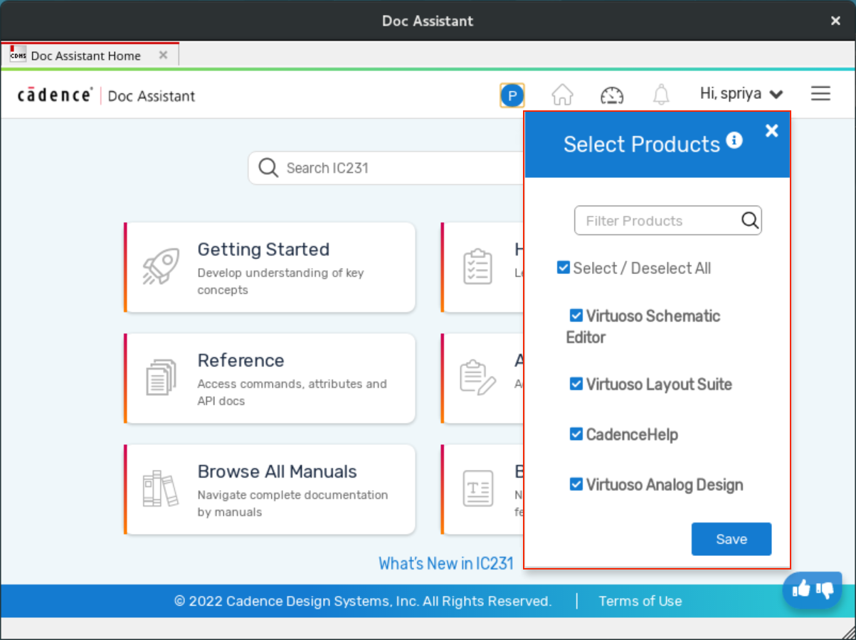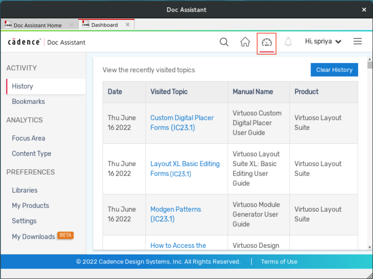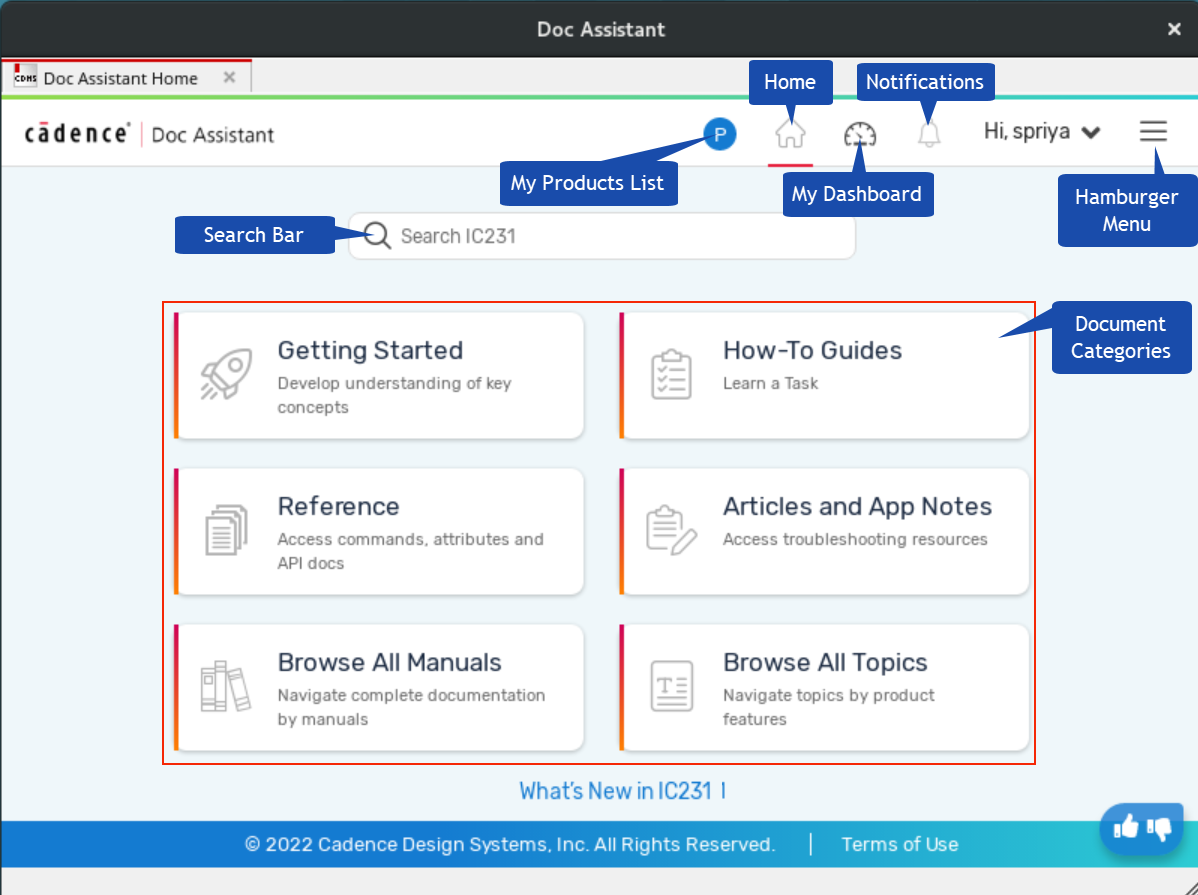 Lets you access recently visited topics and bookmarked page. You can also add more document libraries, change the Doc Assistant settings, and install the latest product documents from this page. See My Dashboard.