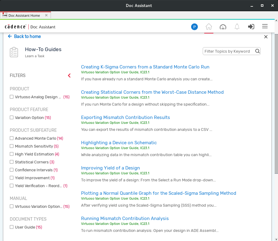 The Doc Assistant home page lists multiple tiles that indicate various topic types or document categories, for example conceptual topics, task-based topics, and reference topics. You can click a tile to display a list of topics. In the following example, all task-based topics (How-To Guides) is listed: