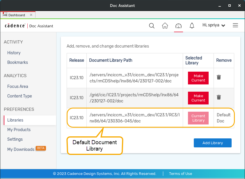 A document library in Doc Assistant can be referred to as a set of documentation for all products installed on your machine. The default document library for Doc Assistant is the library corresponding to the location where Doc Assistant is installed.