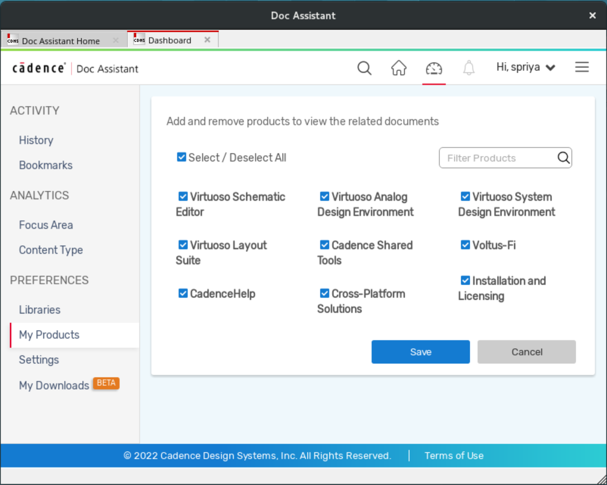 All the products that are installed on your machine appear here. You can select or deselect a product from this list, which will change the order in which content appears in the welcome page, search results, and Cadence Support results.