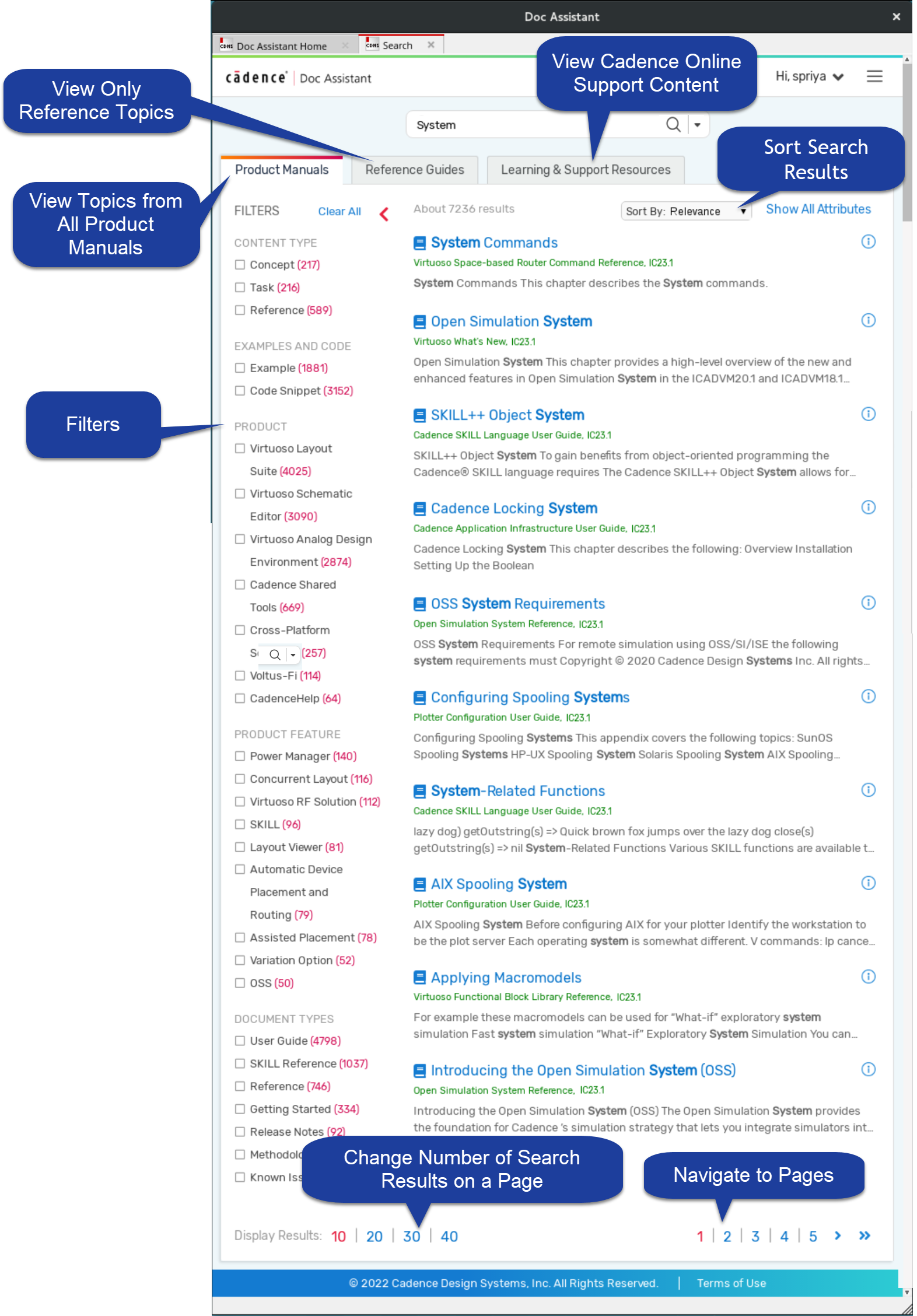 - View content related to your search available on the Cadence Support portal in the Learning & Support Resources tab. Doc Assistant, by default, opens up all the links in this tab within Doc Assistant (as a separate tab). You might have to provide support.cadence.com credentials depending on the licenses you own.