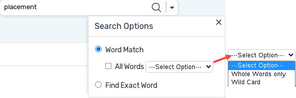 - Word Match, the default option, retrieves topics that contain the specified keyword. Here, you can select whether the tool must match only whole words or honor wildcards.