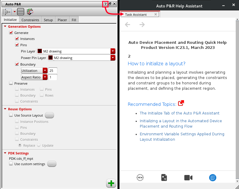 In the following example, the [?] button on the Auto P&R assistant launches the Auto P&R Help Assistant window, which is a Task Assistant window.