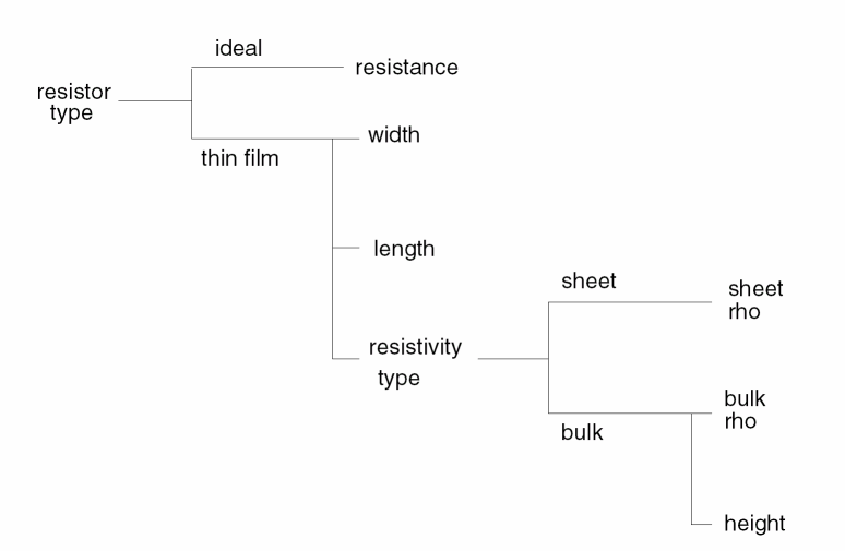 The first parameter is the radio button field, resistorType. It is always displayed and editable and has only two values, ideal and thin_film.