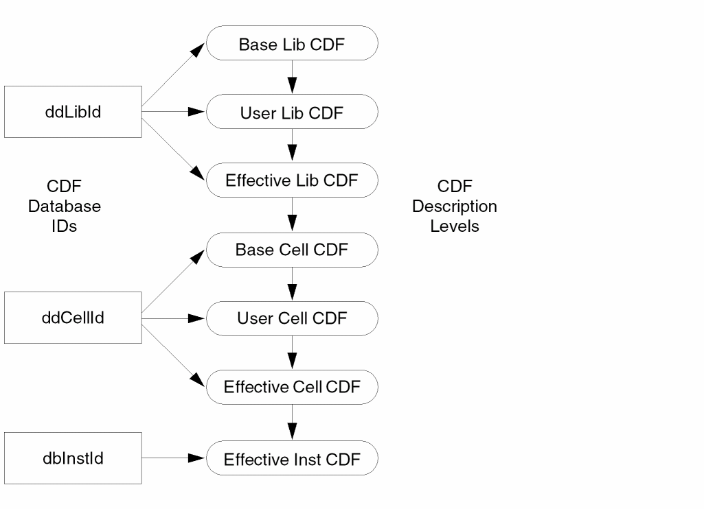 Both libraries and cells can have base- and user-level CDF descriptions. The effective-library CDF is the overlay of the user-library CDF on top of the base-library CDF. The effective cell-level CDF is the overlay of the user cell CDF on top of the base cell CDF, overlaid on top of the effective library-level CDF. Finally, the effective instance CDF is the effective cell-level CDF with instance-specific information added to the CDF description. The following figure shows the relationship between CDF levels and the Cadence database.