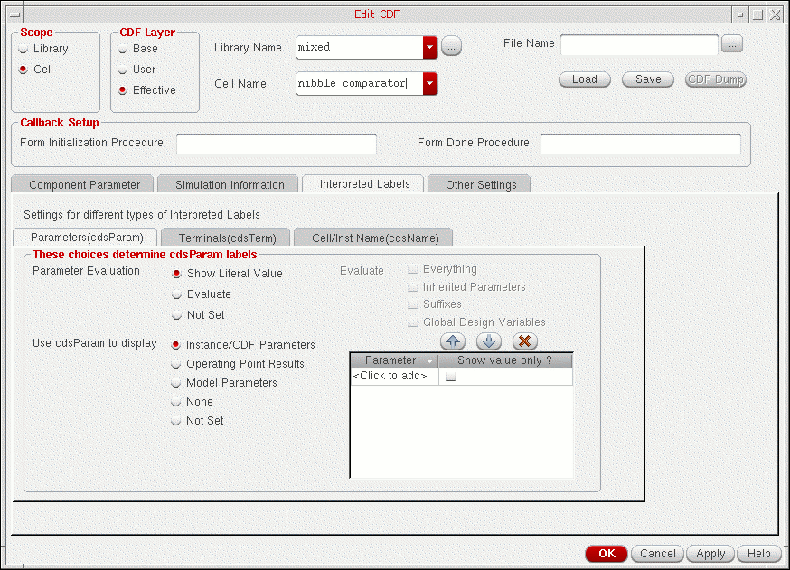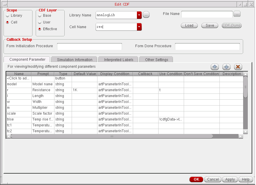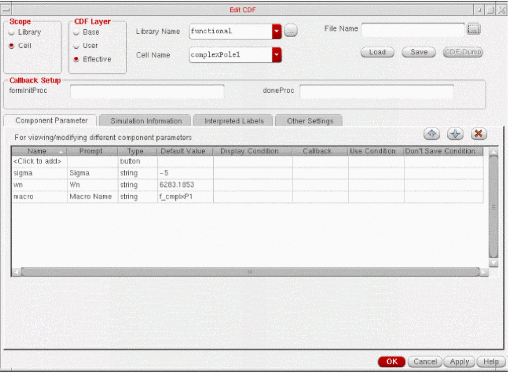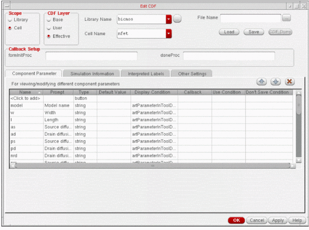 After you enter a CDF cell or library name, the Edit CDF form displays component parameter information in the Component Parameter tab as shown in the following figure. Click the other tabs to examine their contents.
