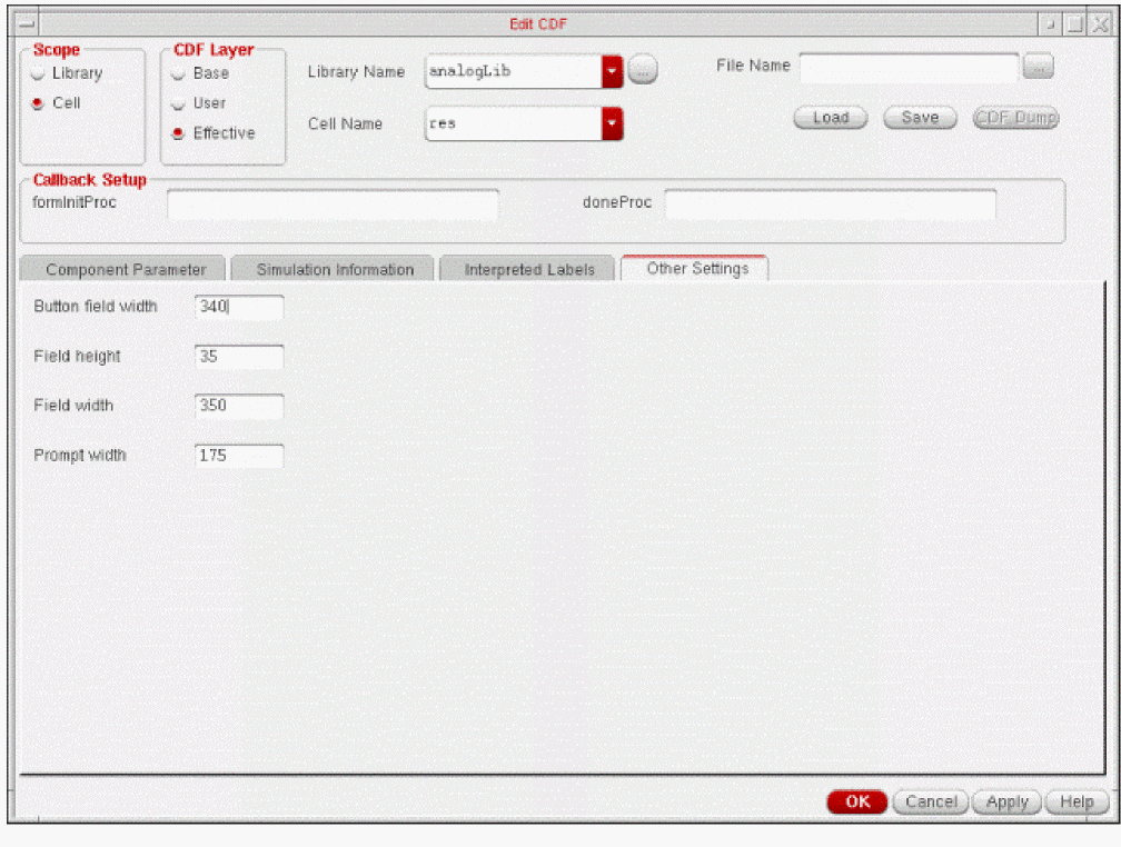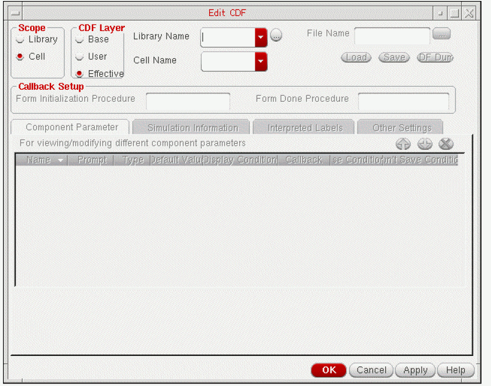 Load loads the CDF information in the file in the File Name field. The Edit CDF form redisplays to show the new information. The editor does not save CDF data to the cell or library until you click OK or Apply.