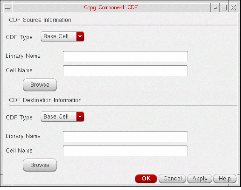 Select the library name using the Library Name cyclic field, or click the browse button to use the Library Browser form to select the library. - Cell Name is the name of the cell whose CDF data you want to edit.