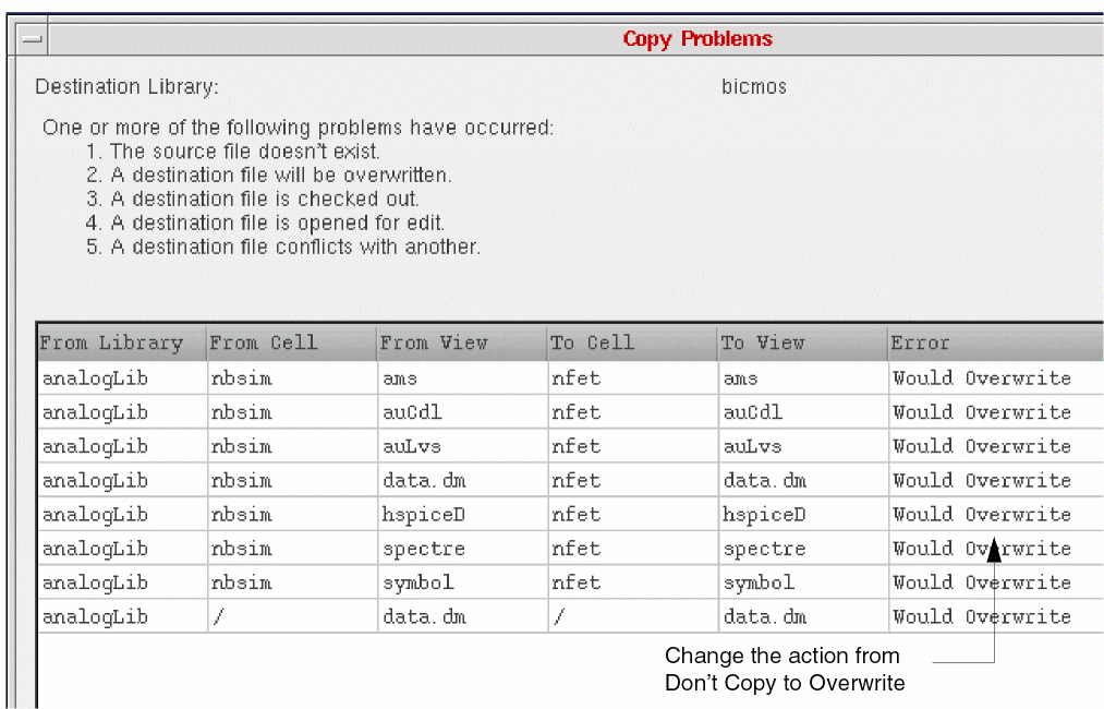 In the Copy Problems dialog box change the Don’t Copy action to Overwrite from the Action cyclic field for each view type.