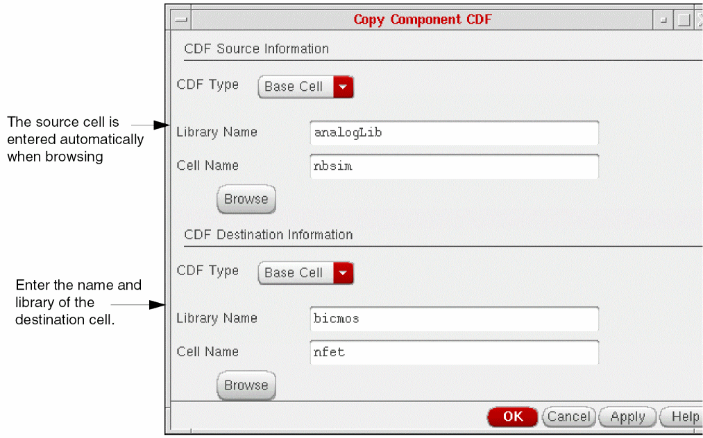 Type the name of your destination library (bicmos) and the cell name (nfet) in the CDF Destination Information section.
