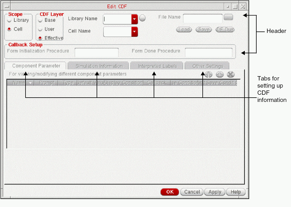 You can use the Edit CDF form to create, view, or edit a CDF description. The Edit CDF form gives you access to all portions of cell and library CDF descriptions. It consists of a header for identifying the library or cell CDF description, specifying procedures for preprocessing and postprocessing CDF data, and four tabs for details about component parameters, simulation information, interpreted labels, and other settings.