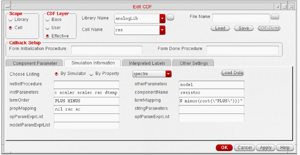 You can use SKILL functions to create, view, or modify CDF information. CDF Functions in Virtuoso ADE SKILL Reference describes the SKILL functions you can use to do the same data entry operations you perform with the Edit CDF form.