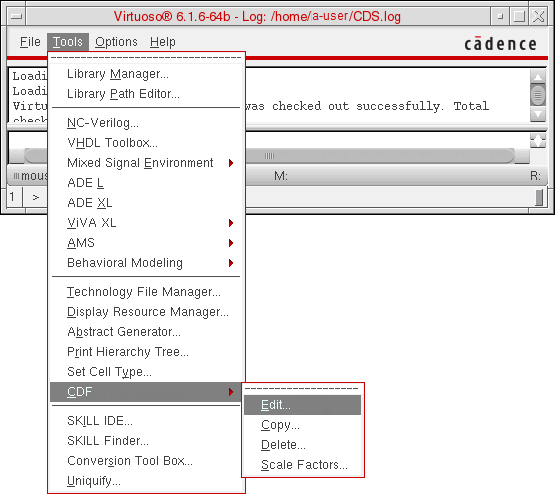 This section describes commands for managing Component Description Format (CDF) information. These CDF commands are on the Tools menu of the Command Interpreter Window (CIW). The following menu is just one of many different Tools menus you might see, depending on which Cadence® software you own. However, all CIW Tools menus have the same CDF commands.