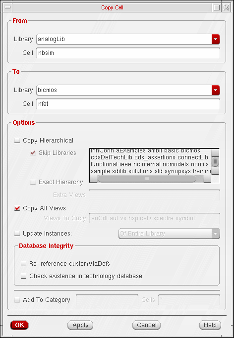 If you copy a cell (component) or library to another cell or library, the CDF data might not be copied. The transfer of CDF data occurs only if the target cell or library never existed and is created in the copy operation. If, however, the target cell or library already exists, or you copy only a cellview (a view of the component), the CDF data of the target cell (or library) remains unchanged. Use the Copy CDF command to avoid this problem.