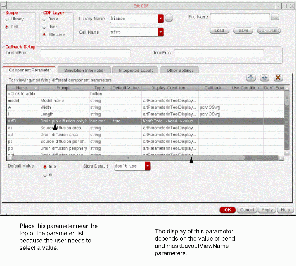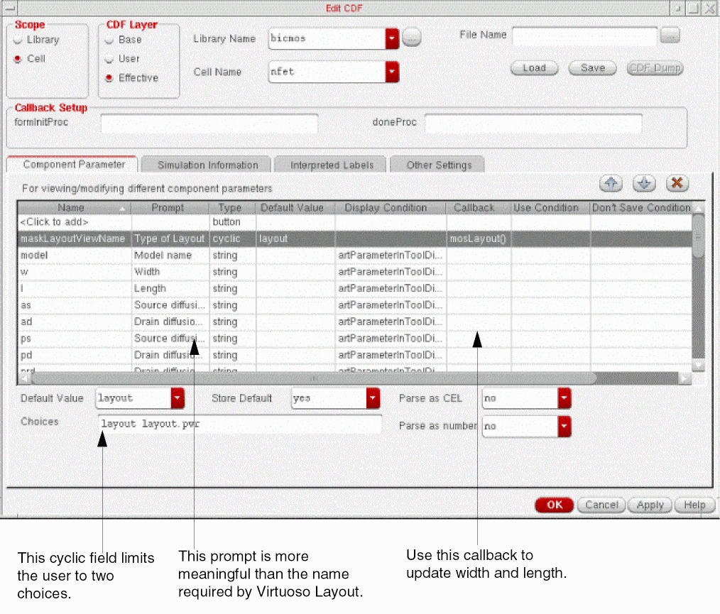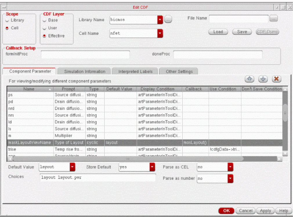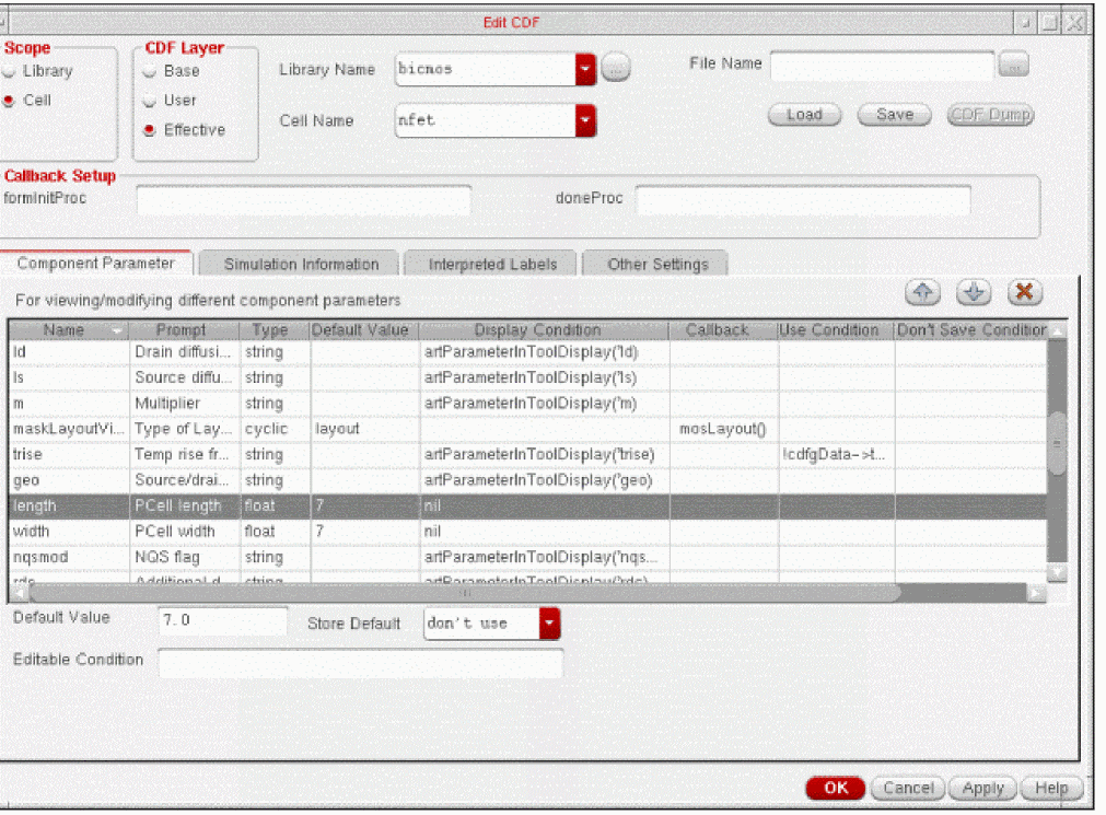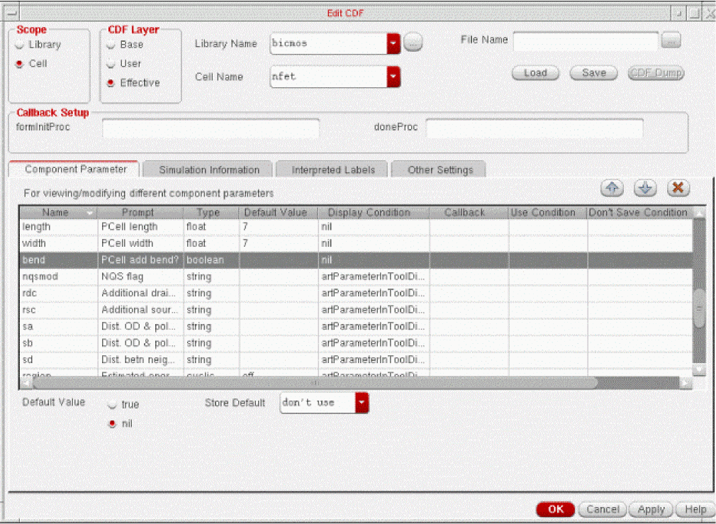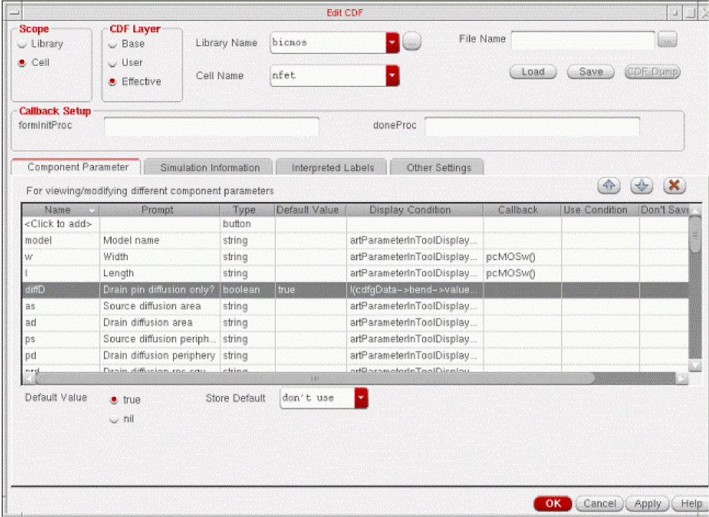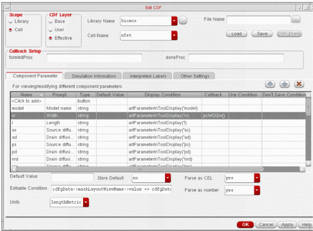 This section shows you how to use the Edit CDF form to set up parameters and their attributes for the NFET cell. You should have the Edit CDF form open for the NFET cell created in Chapter 2, “CDF Commands.”