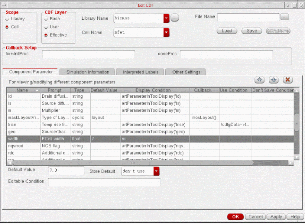 Because you copied the CDF description for the NFET component from the nbsim CDF description, there is already a width parameter w in the CDF setup for the simulators. You can set up a callback that updates the width parameter whenever the w parameter is updated. Then designers don’t have to enter the width twice.