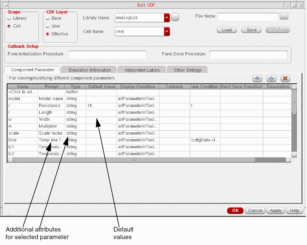 All the parameter attributes descriptions in the previous section apply whether you are using SKILL or the Edit CDF form. The following sections describe how you edit parameters using either method.