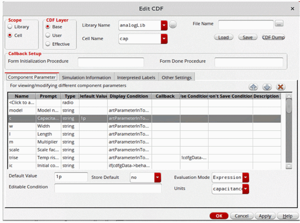- Create two CDF parameters. One is a string variable for the schematic instantiation of the Pcell symbol. The other is a floating -point number variable for the Pcell layout view. You must maintain both variables.