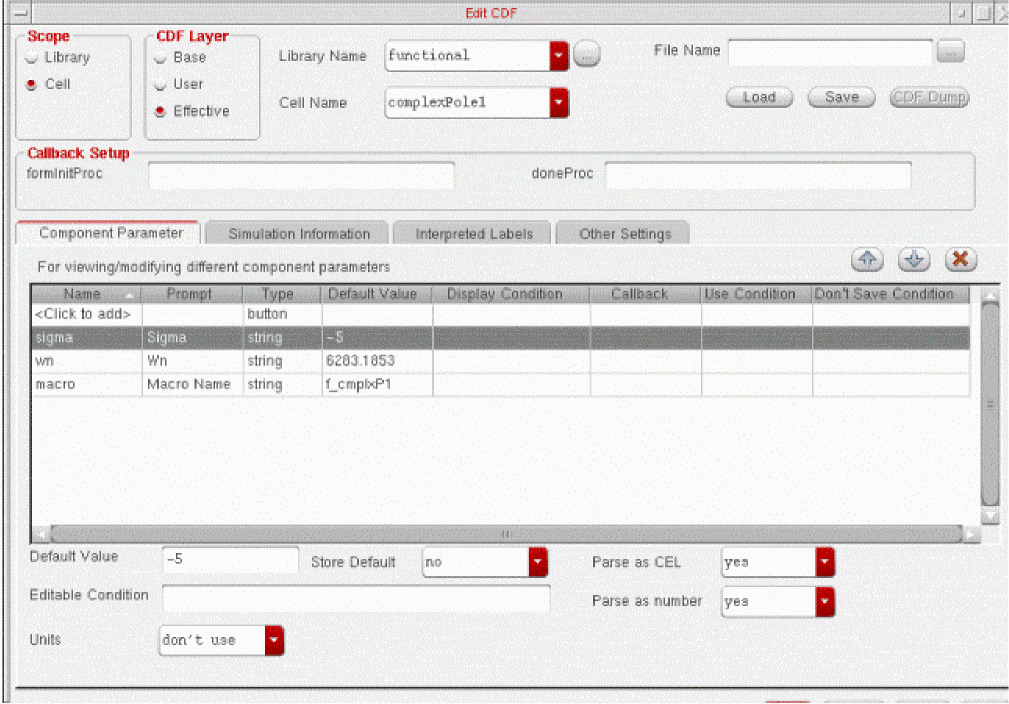 The parameter name is set to sigma. The prompt used in the Edit Object Properties and Add Instance forms is Sigma. When you are done, you see the parameter name Sigma, but the system keeps track of the parameter by its real name, sigma. The parameter has a Type equal to string. The default value of sigma is -5, so every instance of the complexPole1 in a schematic has this value initially. The Parse as number and Parse as CEL attributes are set to yes (true).