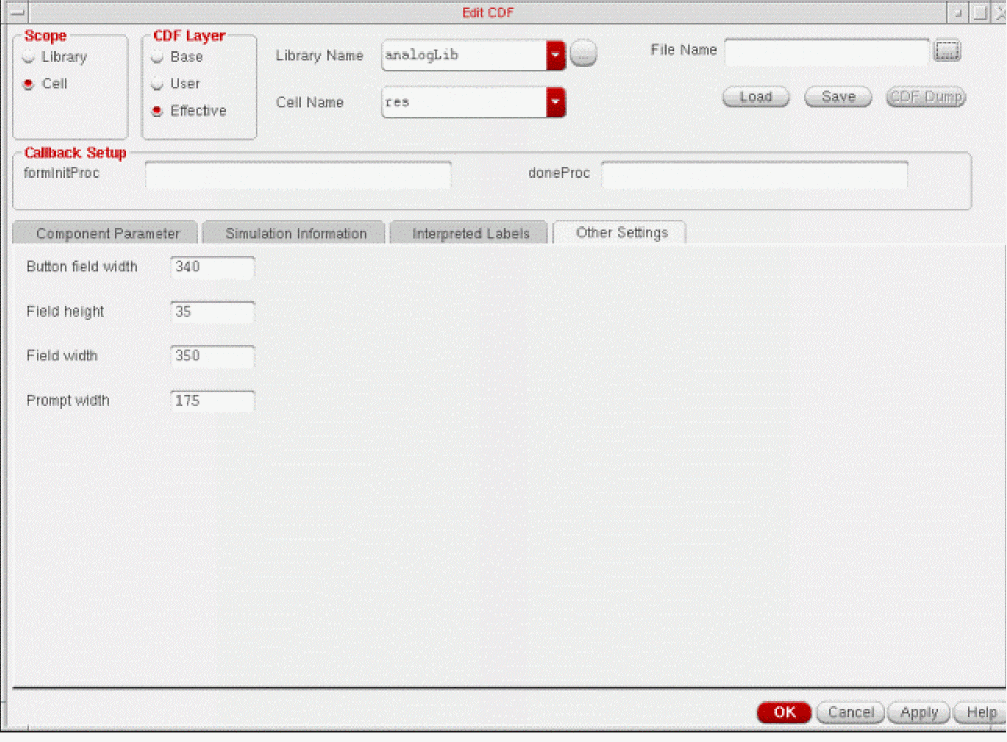 The formInitProc field in the header of the Edit CDF form lets you enter the name of an optional procedure for preprocessing CDF data. The procedure executes when the contents of the CDF are displayed on a form, such as the Add Instance form or the Edit Object Properties form. The procedure takes a single argument, cdfDataId, which is the database object that represents the CDF description for the component being loaded into the form. You enter only the function name (with no parentheses) in the formInitProc field.